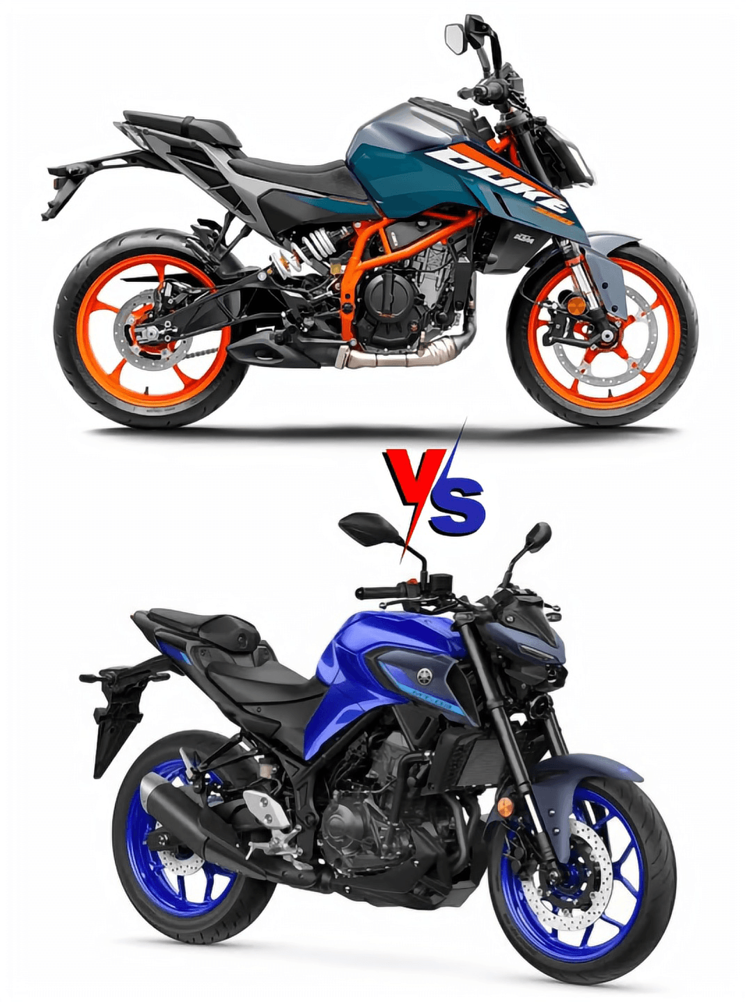 KTM Duke 390 ज्यादा एग्रेसिव और पावरफुल है, जबकि Yamaha MT-03 स्मूद और रिफाइंड परफॉर्मेंस देती है। Duke तेज एक्सीलरेशन के लिए मशहूर है, वहीं MT-03 कंट्रोल्ड राइडिंग का मज़ा देती है।